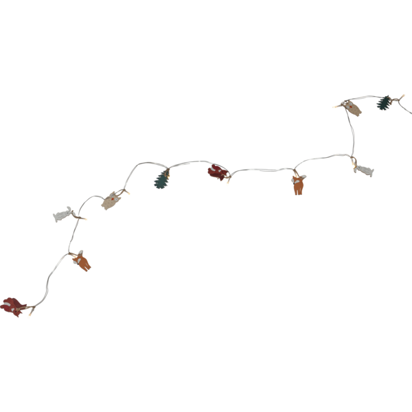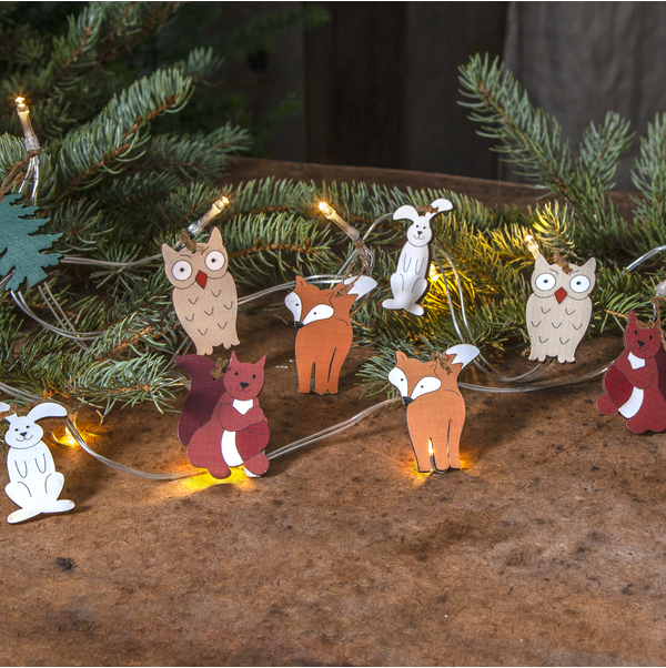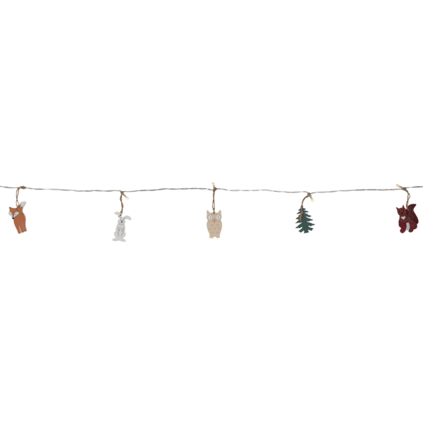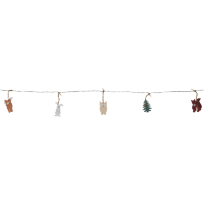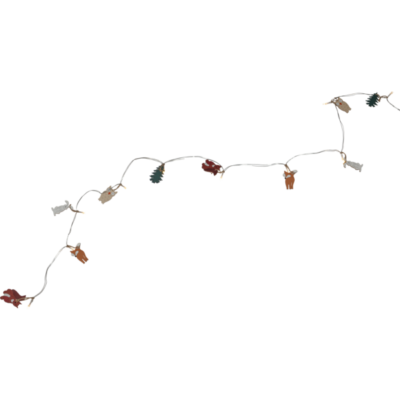 Šviesų grandinė vidaus naudojimui: dekoruota 10 spalvingų medinių figūrėlių. Figūrėlės yra sujungtos virve. Dekoratyvinis akcentas, kuris suteikia namams jaukumo.