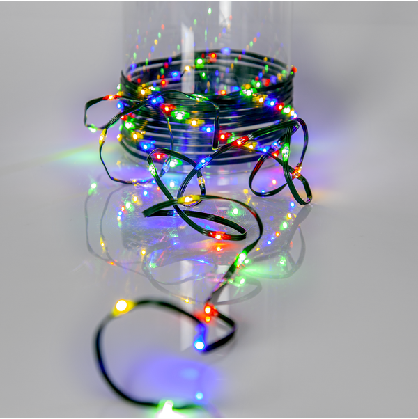 Plonas plokinis šviesų girlianda su mažais šviesos šaltiniais lauko sąlygoms. Puikiai tinka medžiams, krūmams, laiptų turėklams ir kt. Žalias kabelis su 480 spalvotų LED, tarp lemputių atstumas 7,5 cm, sudaro apie 36 m ilgio šviesų girliandą.