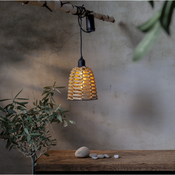 Stilingas rudos spalvos plastikinis šviestuvas, kurio viduje yra susukta LED lemputė. Maitinama akumuliatoriumi ir turi laikmačio funkciją.