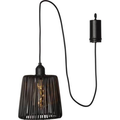 Stilingas juodo plastiko rotango išorinis šviestuvas, kurio viduje yra susukta LED lemputė. Maitinama akumuliatoriumi ir turi laikmačio funkciją.